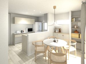 キッチン横のフリースペースでは、パントリーや書斎スペースなど様々な用途としてお使いいただけます。