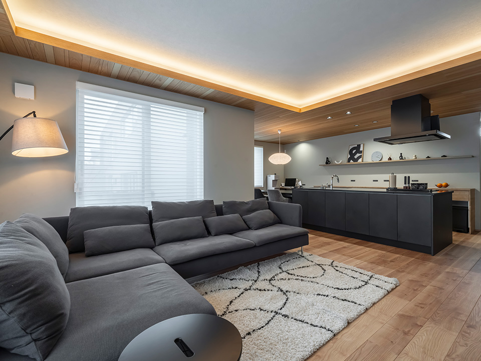 間接照明が棚板をやわらかく照らし、作業に集中しやすい環境をつくりながら、書斎としても趣味の空間としても心地よく使える設計です。