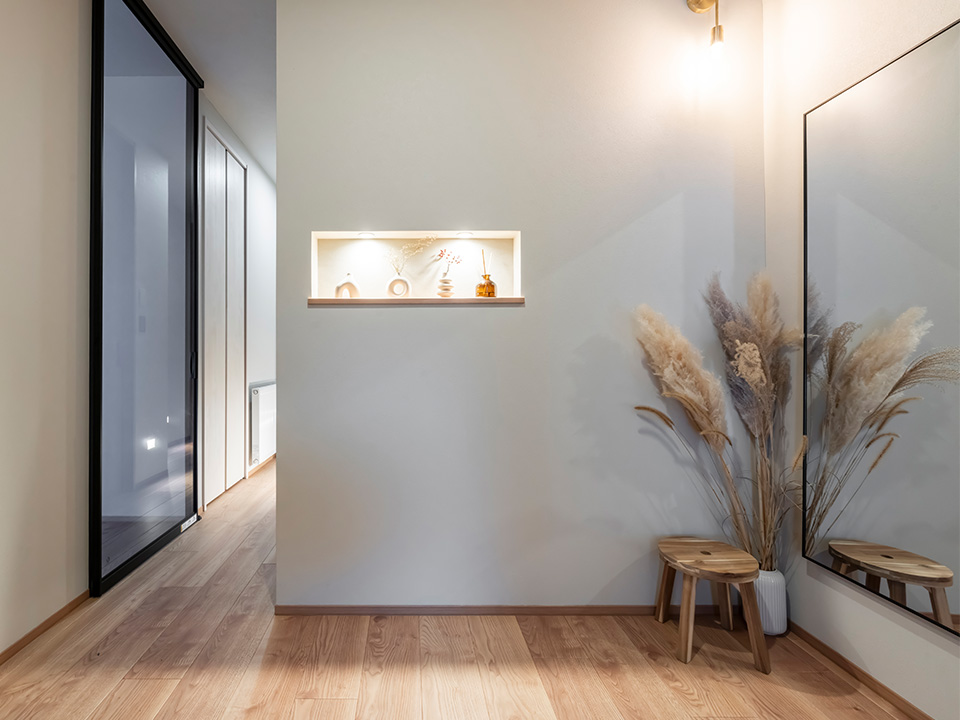 UT とは別に洗面カウンターを玄関ホールに設けます。「ただいま~」と帰宅したらまずは手洗いうがい。お客様にも遠慮なく使ってもらえます