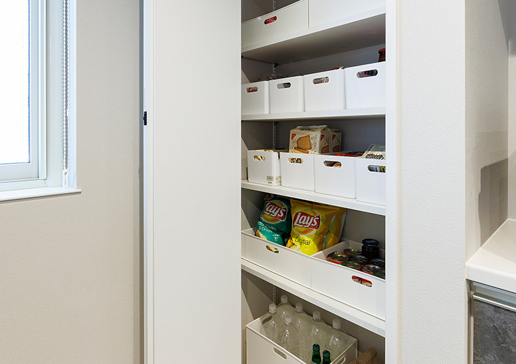 - 仕分けて見やすく!がコツのパントリー。粉物や缶詰、パスタ類やレトルト食品など、ジャンル別に分けてグループ化。パッケージを見やすく並べることで、料理の手際もスムーズに。