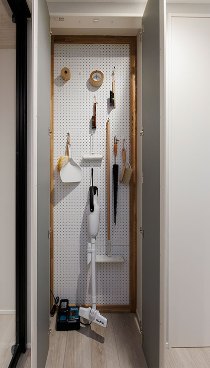- 使用頻度の高い掃除道具は、出し入れがしやすく、ひと目でわかる壁掛け収納がオススメ。