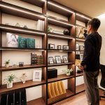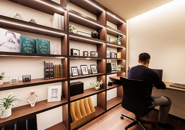 - 間接照明が棚板をやわらかく照らし、作業に集中しやすい環境をつくりながら、書斎としても趣味の空間としても心地よく使える設計です。