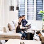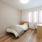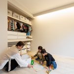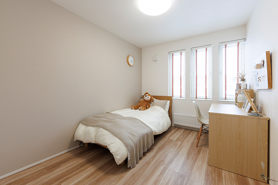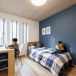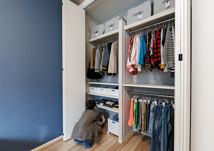 - 子どもが小さなうちは、家事をしながら目が届くよう、リビング横の洋室をキッズルームにします。おもちゃの出し入れがしやすいよう、収納は扉をつけずオープンに。