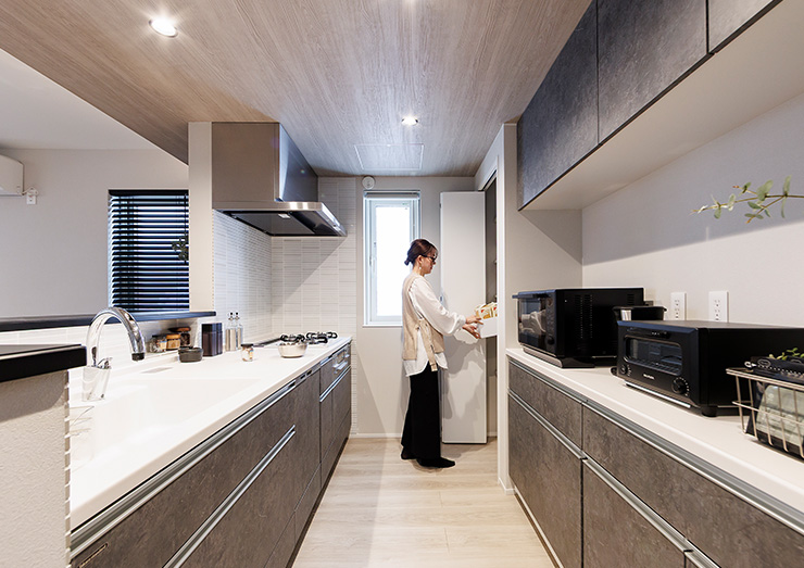 - 左右に作業台と収納を配置したⅡ型キッチンが、調理・配膳・片付けまでの流れをスムーズに整えます。