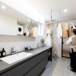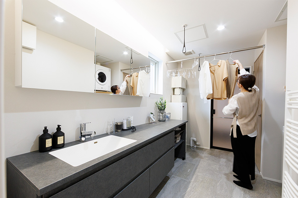 - 洗濯もののアイロンがけやたたむ作業がラクにできるワイドカウンター。リネン棚を設けてタオルや下着を分けて収納。メイクやネイルもゆっくりできます。