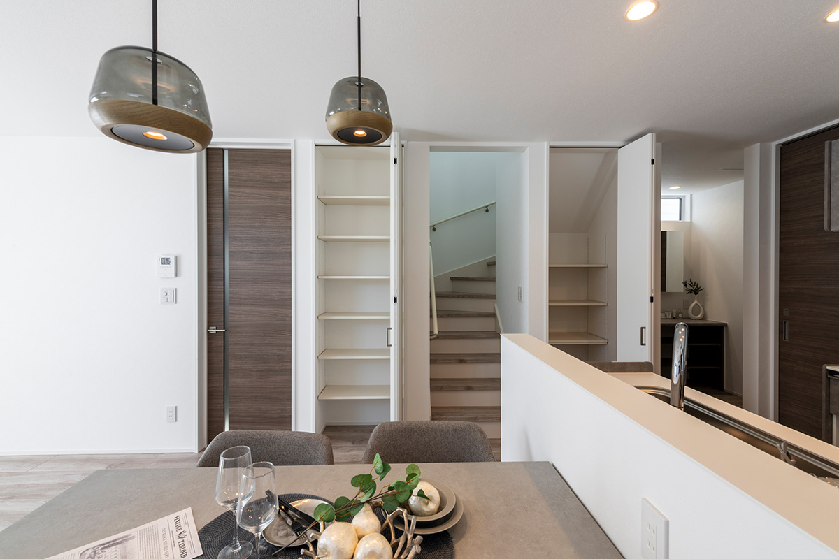 1階はキッチンから洗面スペース・脱衣室への動線を考慮した家事が楽になる形となっております。