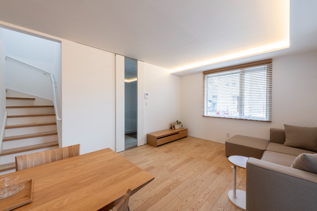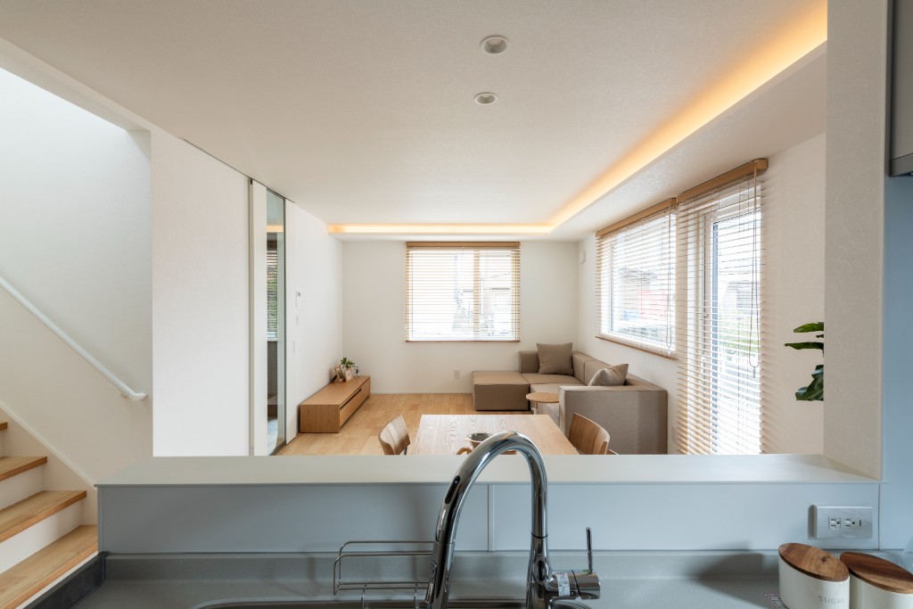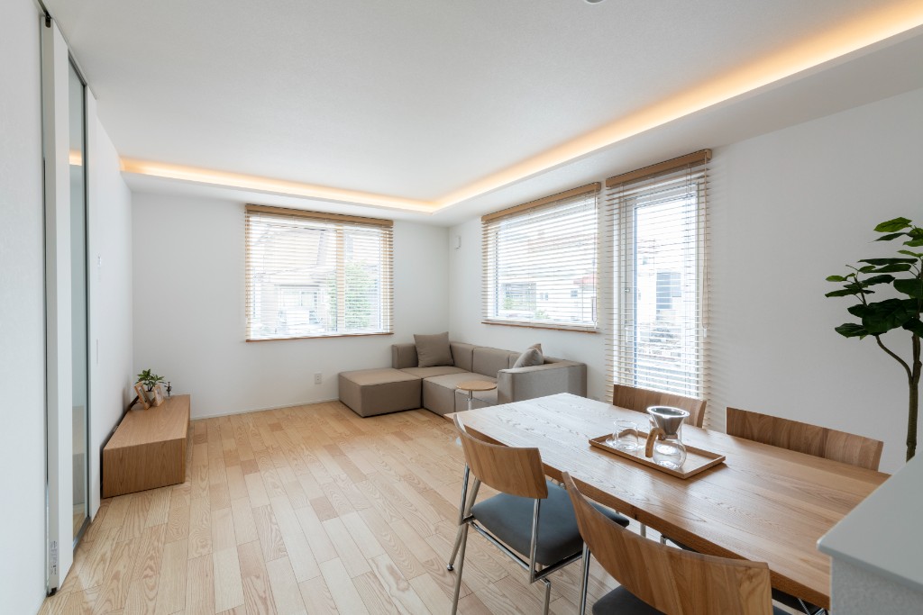 リビングから隣地への距離が広くとれているので窓を大きく確保し、より開放的に感じられる形となっております。