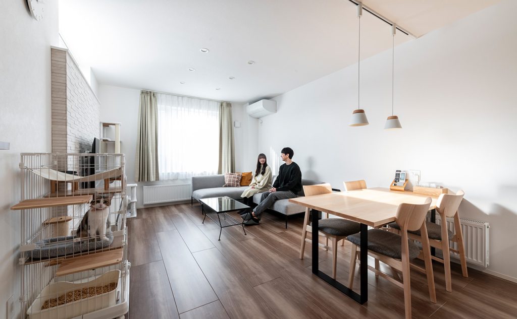 白い余白と、ストレスのない生活動線。無理なく心地よく暮らせる家が、今日も夫婦と猫をやさしく迎えています。