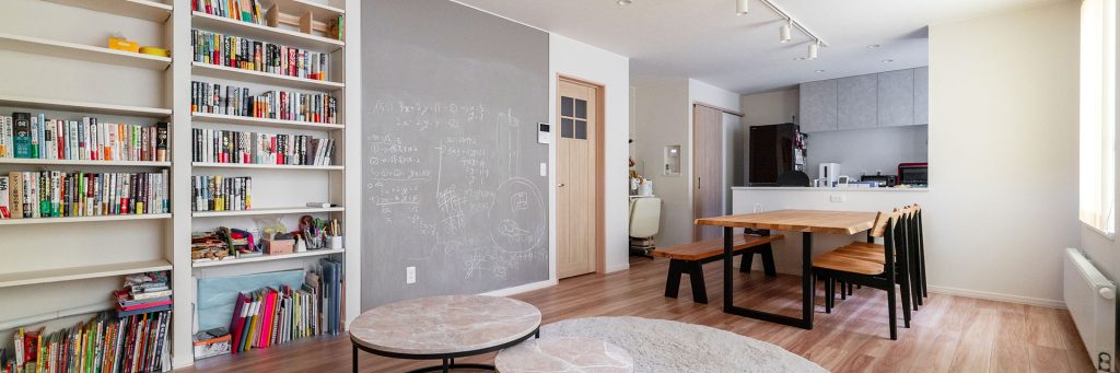 壁一面の本棚には家族のお気に入りの本が並び、隣のチョークボードでは子どもたちが自由に描いて楽しめます。
