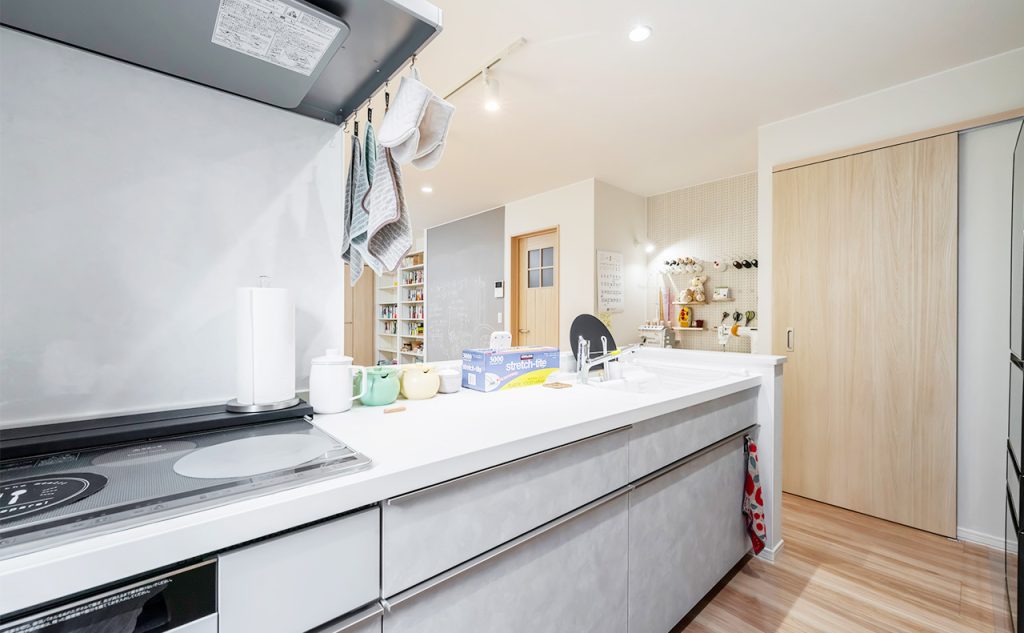 ダイニングとキッチンがゆるやかにつながり、家族の会話が心地よく響く設計。