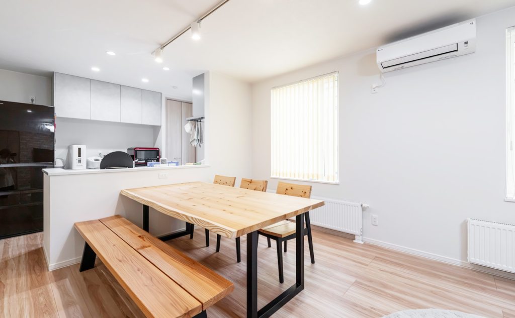 ダイニングとキッチンがゆるやかにつながり、家族の会話が心地よく響く設計。