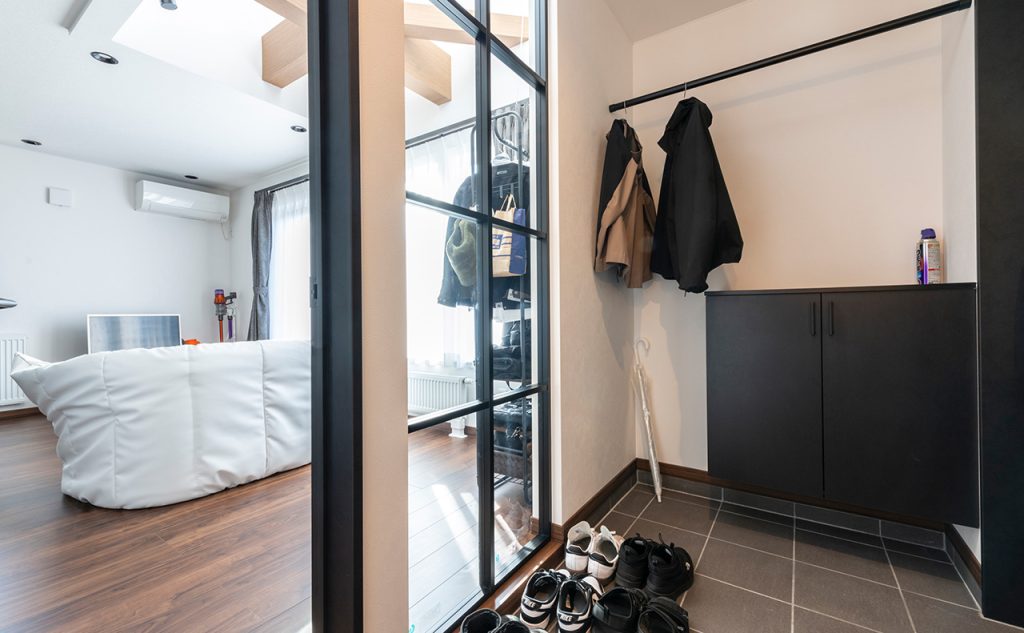 玄関は壁を極力減らし、リビングの吹き抜けや大きなガラス面と連続させることで、実際の面積以上の開放感を演出しました。