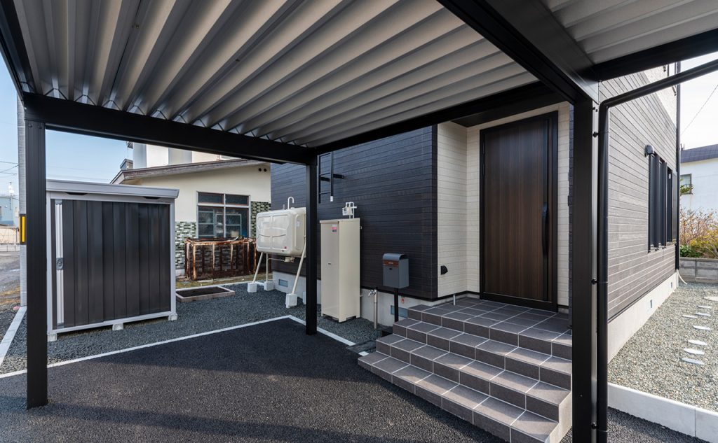 玄関は壁を極力減らし、リビングの吹き抜けや大きなガラス面と連続させることで、実際の面積以上の開放感を演出しました。