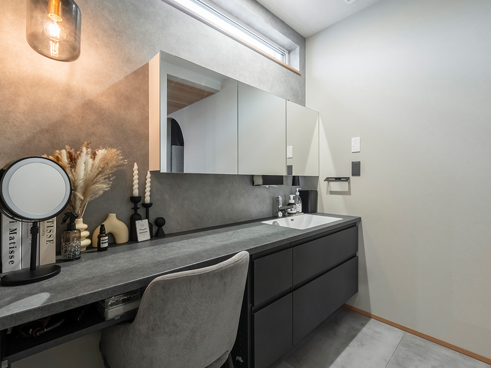 洗濯もののアイロンがけやたたむ作業がラクにできるワイドカウンター。リネン棚を設けてタオルや下着を分けて収納。メイクやネイルもゆっくりできます