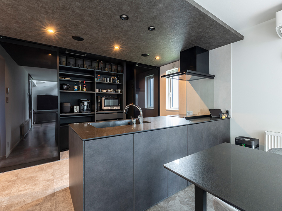 間接照明が棚板をやわらかく照らし、作業に集中しやすい環境をつくりながら、書斎としても趣味の空間としても心地よく使える設計です。